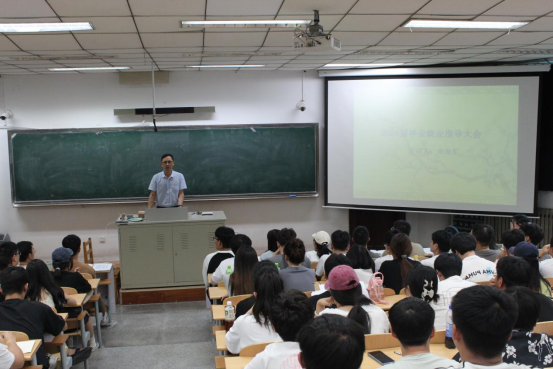 余书记全面介绍了当前就业形势,对学院往届毕业生就业去向情况进行重点分析,介绍了本科毕业生整体的升学与就业情况,分析了近三年考研报考与录取数据,解答了毕业生关心关注的热点问题,并对做好2024届毕业生就业工作进行动员。他勉励在场毕业生同学,起步就要提速,起跑就要争先。一要认清就业形势,明确就业目标与行动计划;二要规划得当,准备充足,积极做好考研、就业准备工作;三要掌握考研报名、校园招聘等信息,尽早落实毕业去向。学院将从就业指导、就业信息发布、简历与面试指导等方面为每一名同学提供分类指导和有力保障,并联动辅导员、班主任等育人力量,为就业困难同学提供全方位帮扶。