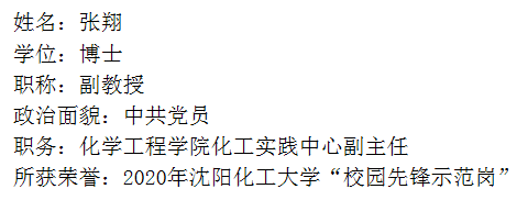 张翔同志是化学工程学院化工实践中心副主任,一名普通的共产党员,他在平凡的工作中,一丝不苟,默默奉献,受到院校领导和老师以及同学们的赞许和喜爱。多次获院先进个人,优秀共产党员。